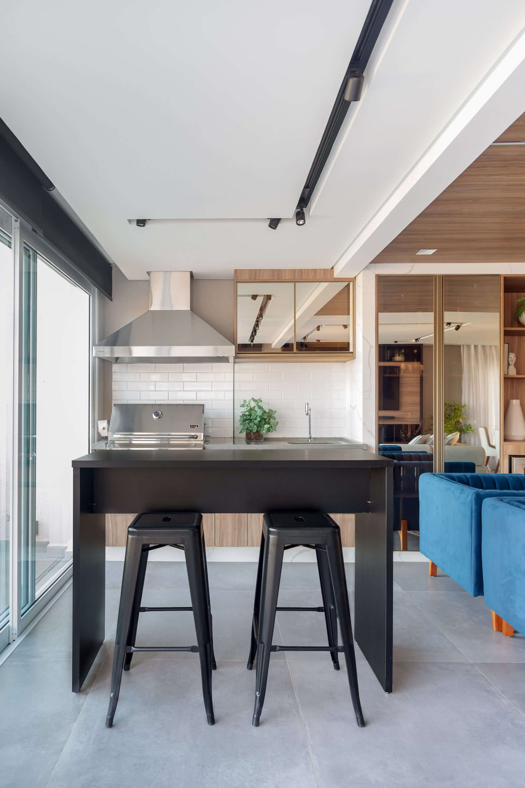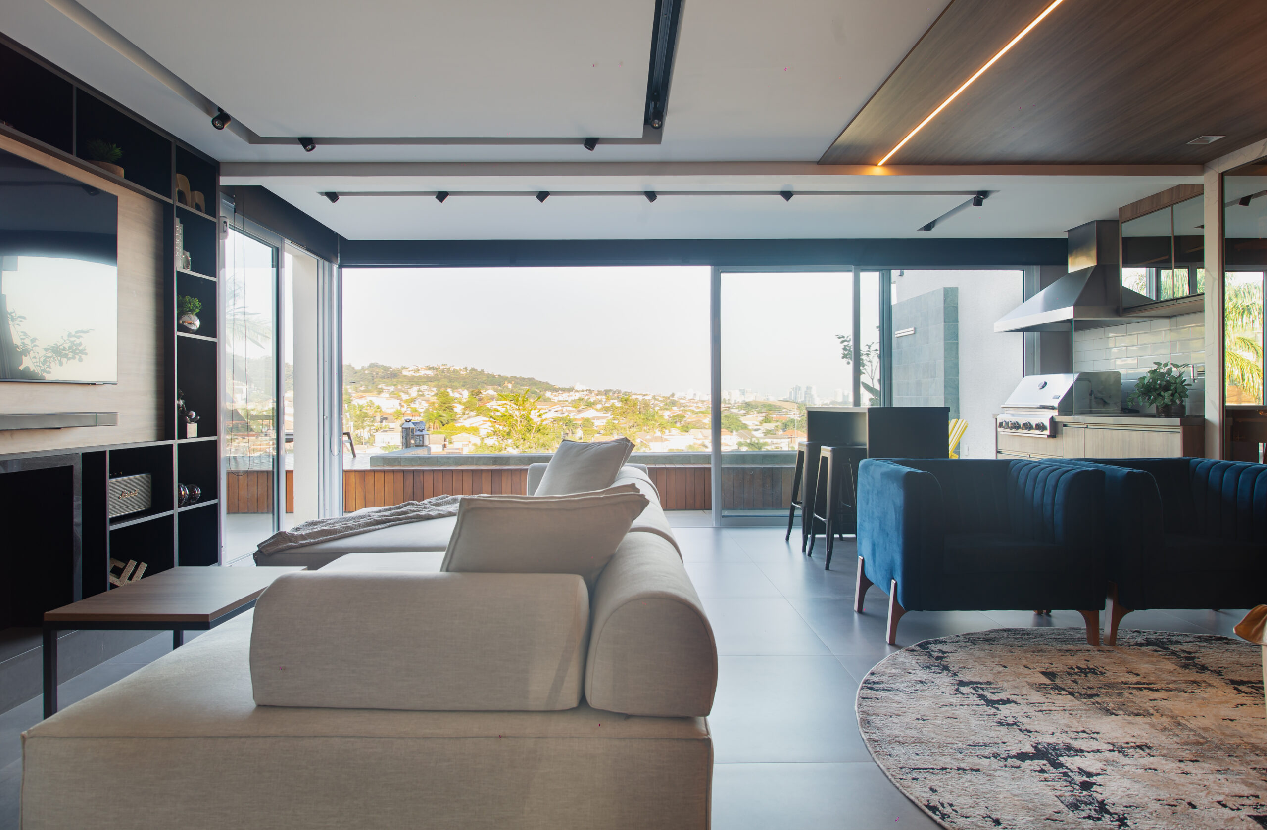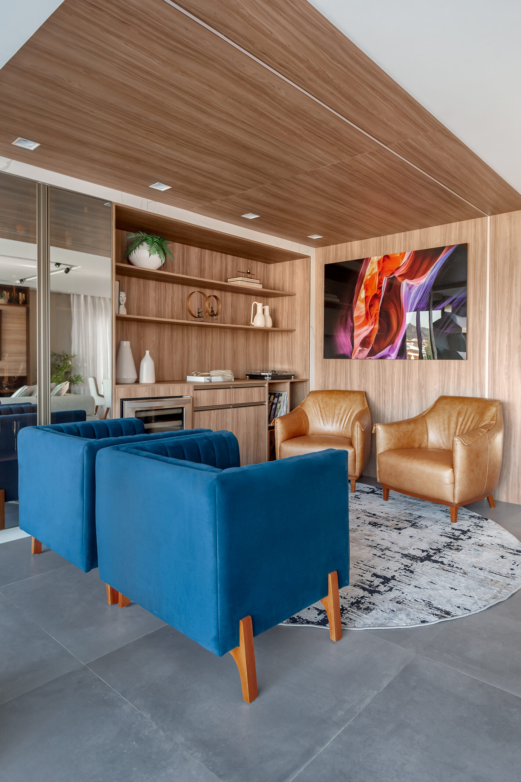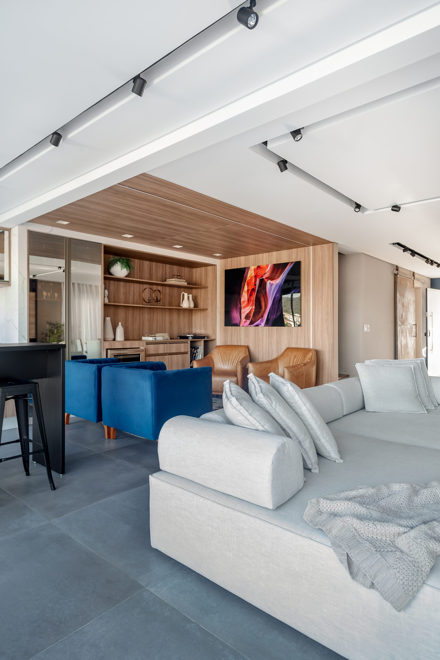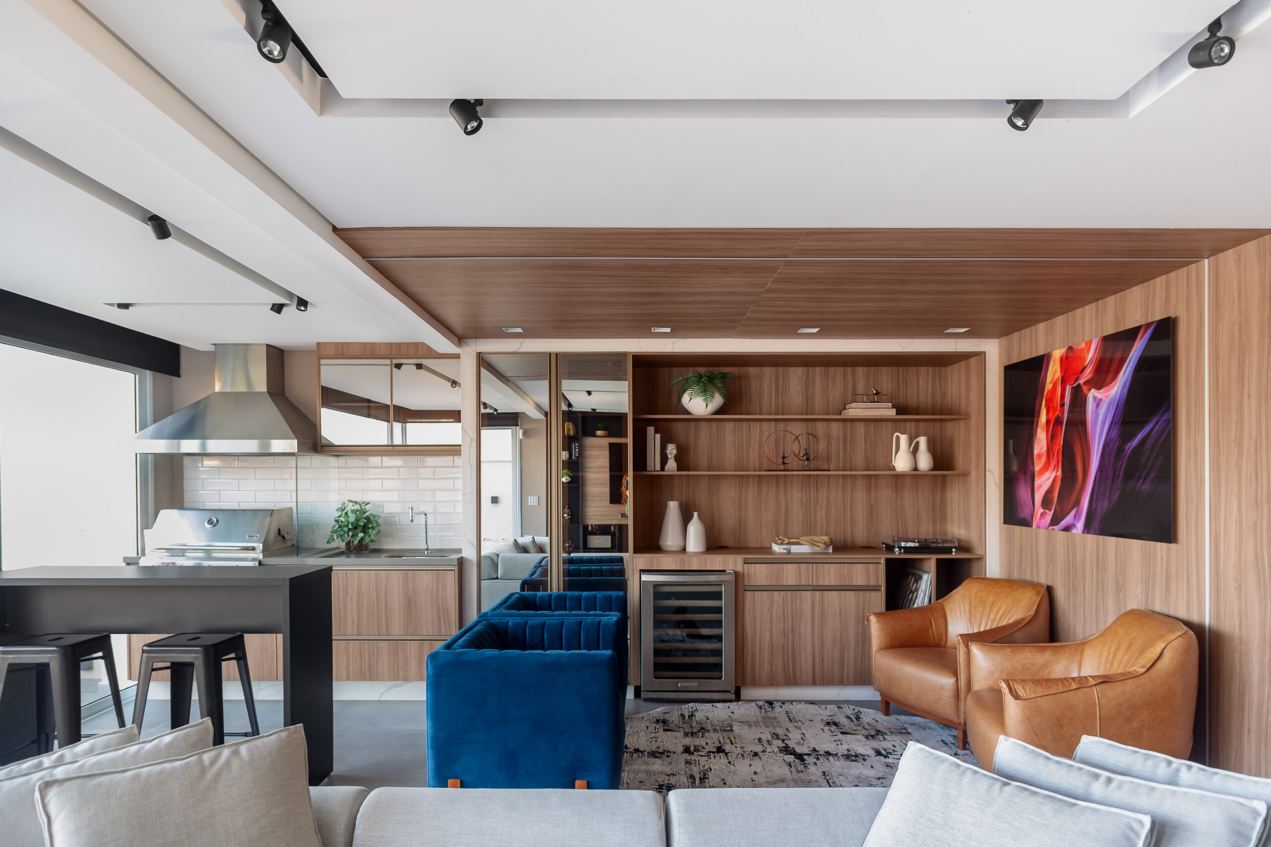 Neste projeto, a marcenaria é o elemento estrutural que conecta living, bar e área gourmet. A execução da Blomarq combina um extenso painel amadeirado, que aquece o ambiente, com o contraponto sóbrio da laca preta no home theater. Detalhes como a adega climatizada integrada e a iluminação de LED precisa demonstram nossa capacidade técnica de executar projetos de alto padrão para arquitetos.