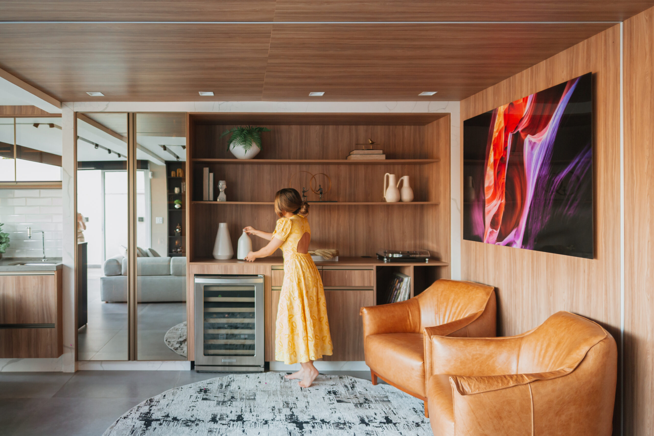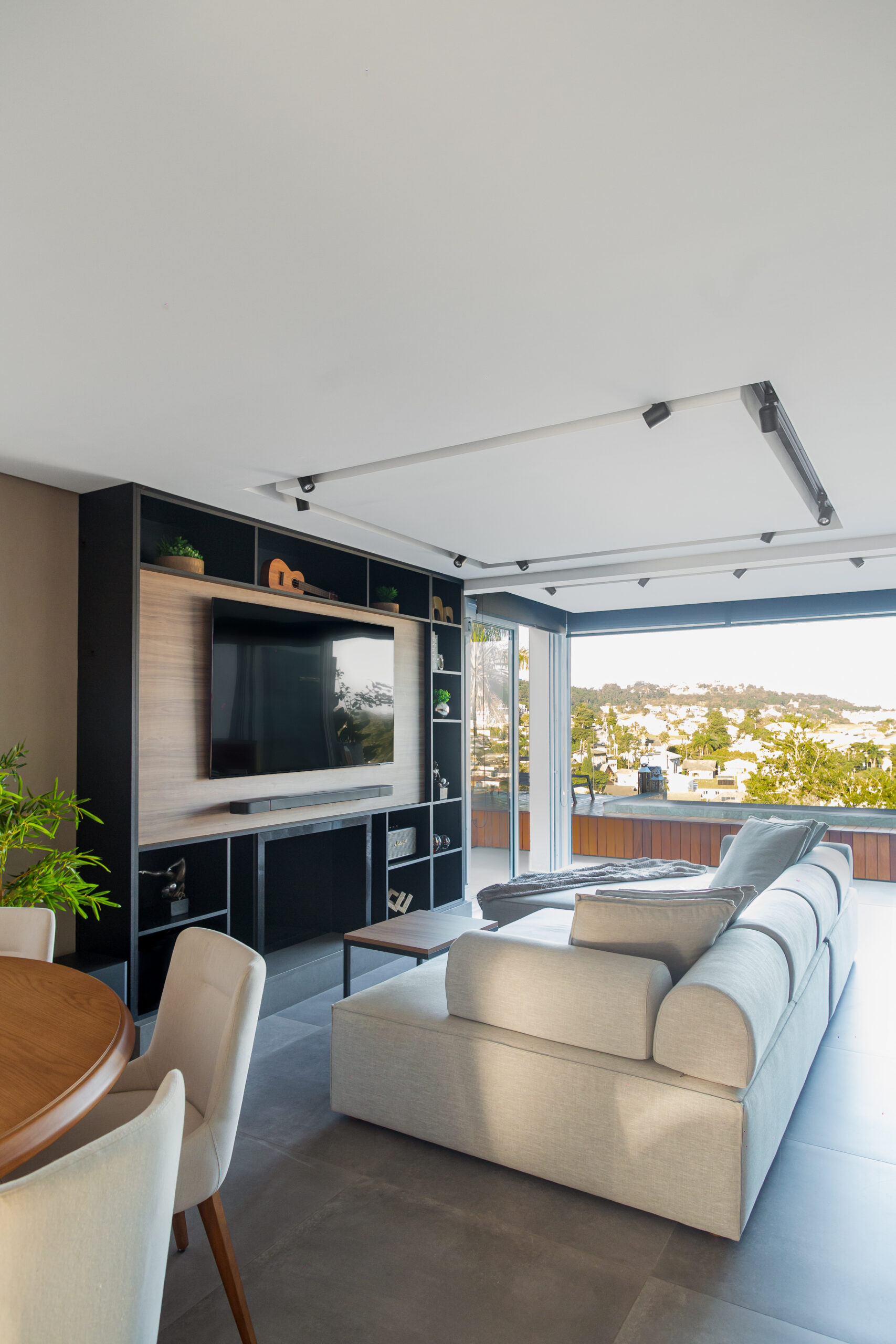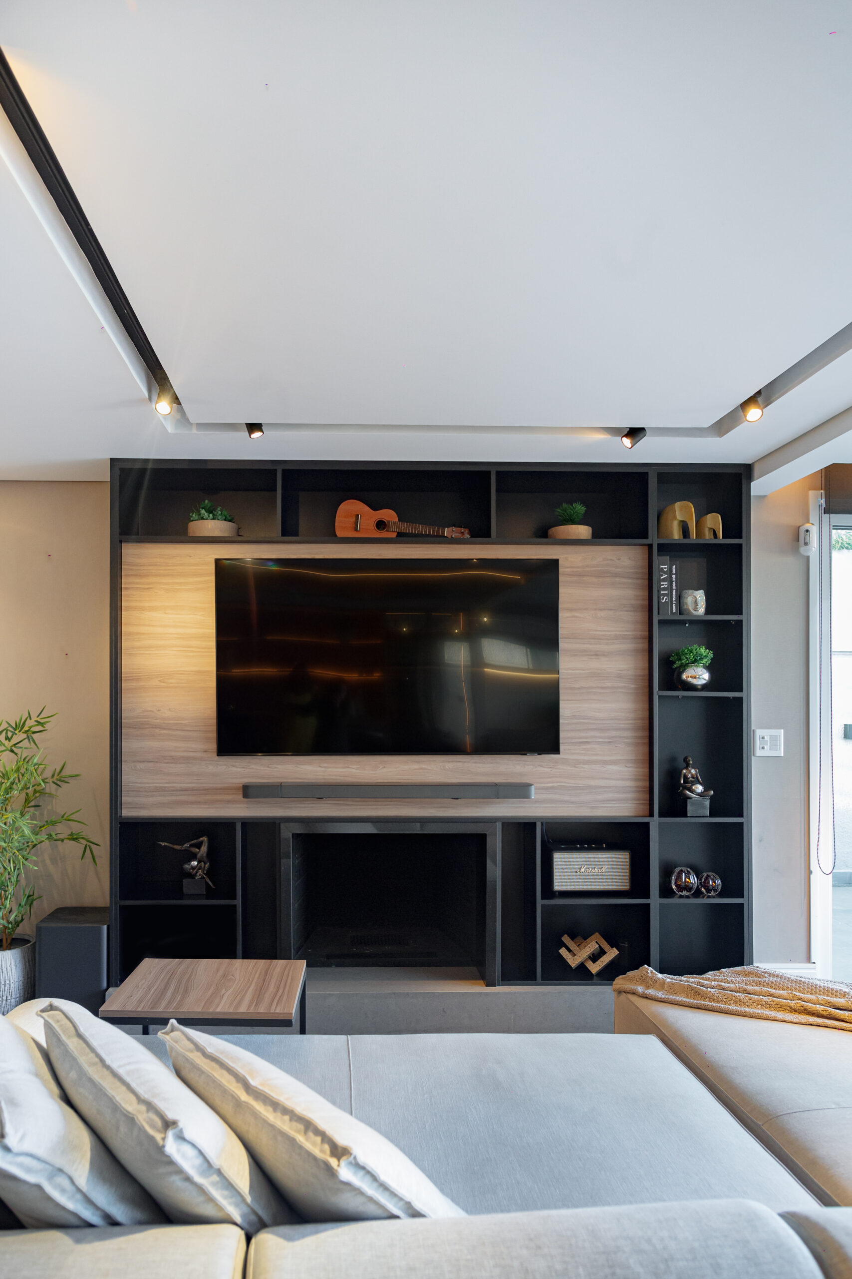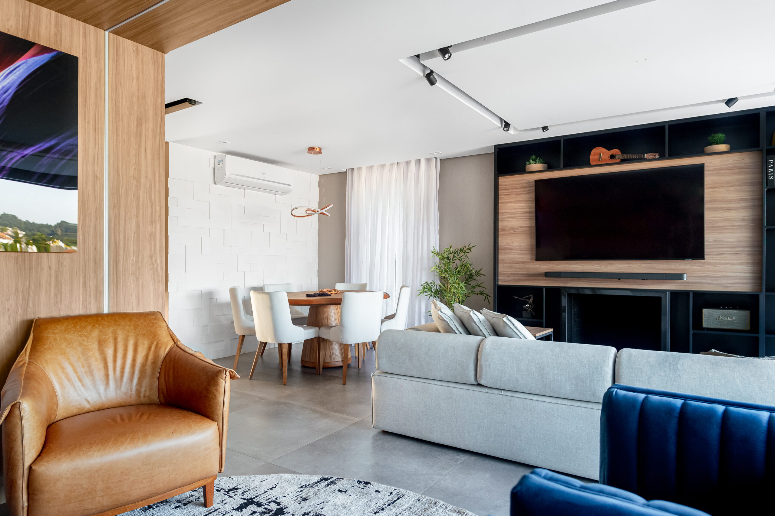Neste projeto, a marcenaria é o elemento estrutural que conecta living, bar e área gourmet. A execução da Blomarq combina um extenso painel amadeirado, que aquece o ambiente, com o contraponto sóbrio da laca preta no home theater. Detalhes como a adega climatizada integrada e a iluminação de LED precisa demonstram nossa capacidade técnica de executar projetos de alto padrão para arquitetos.