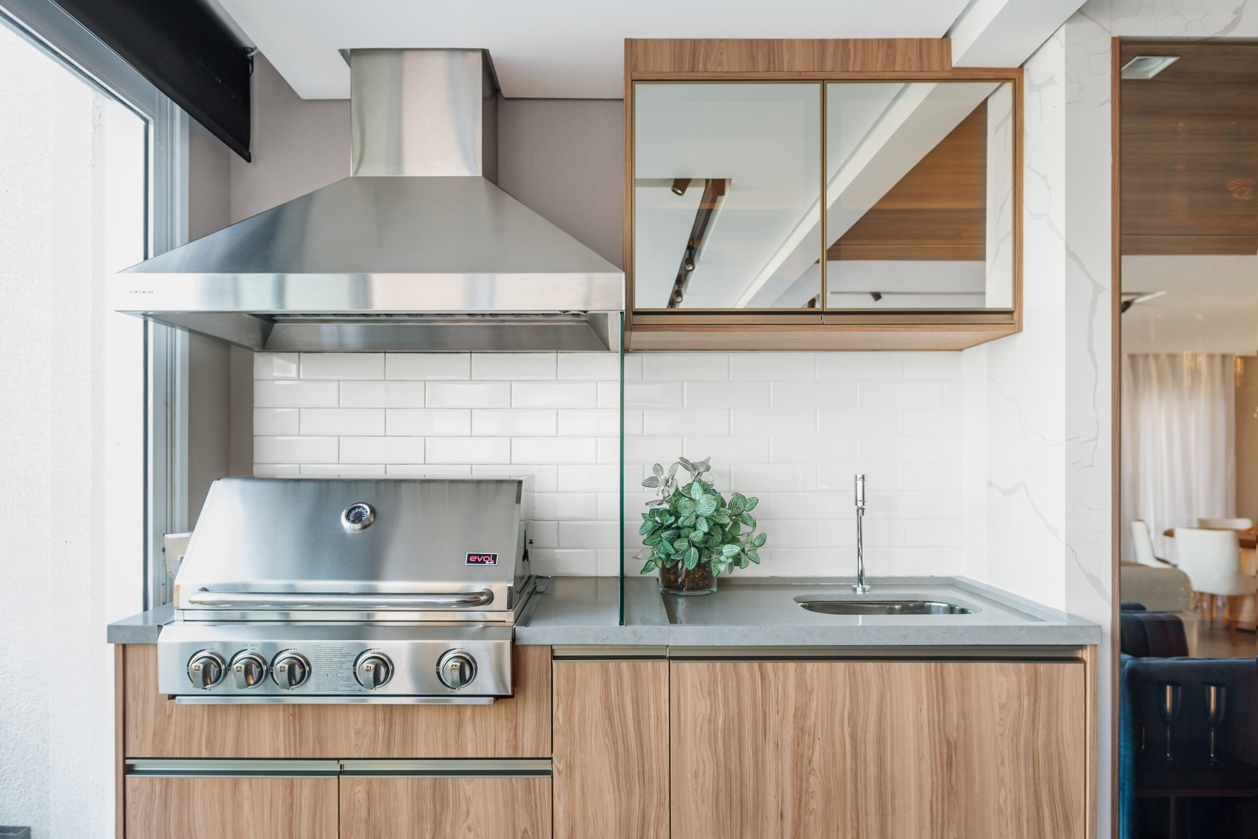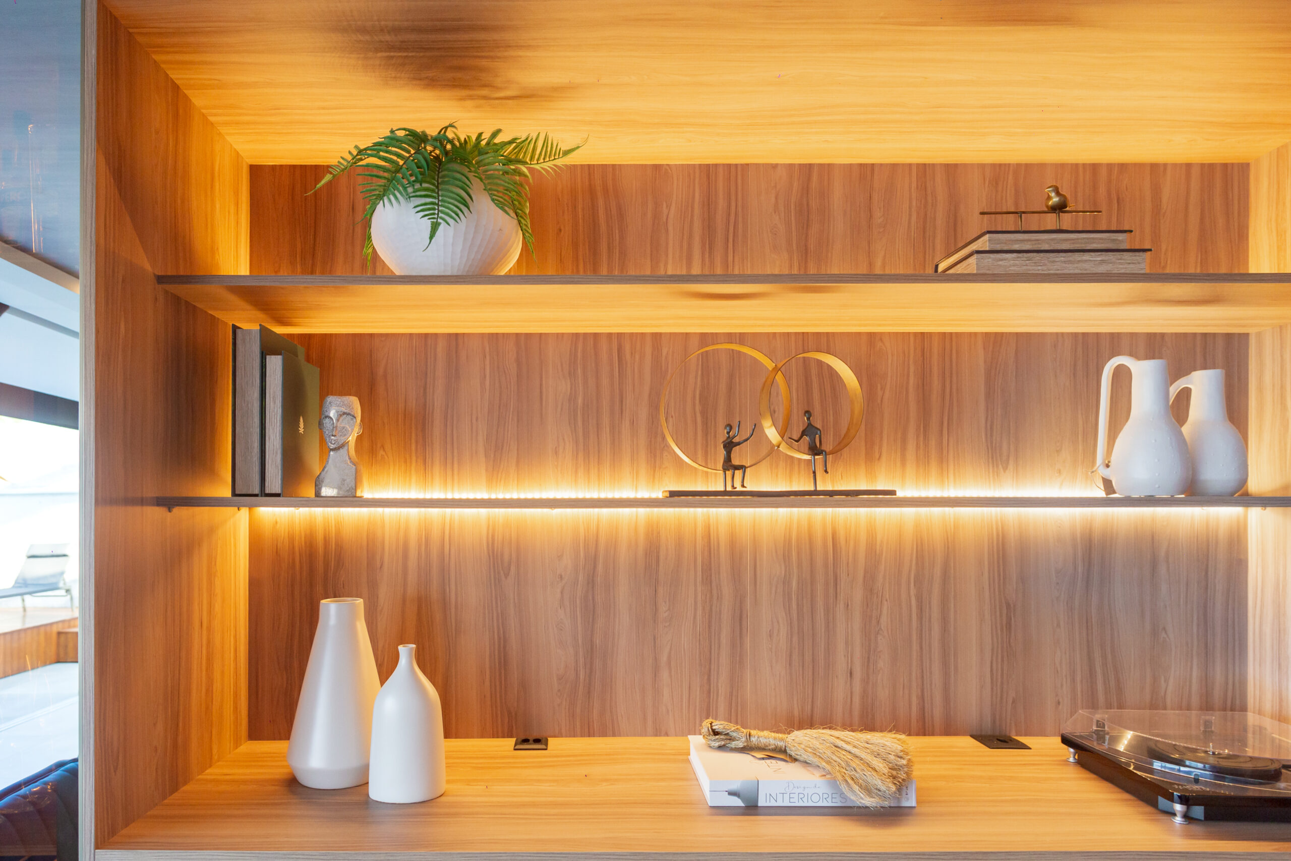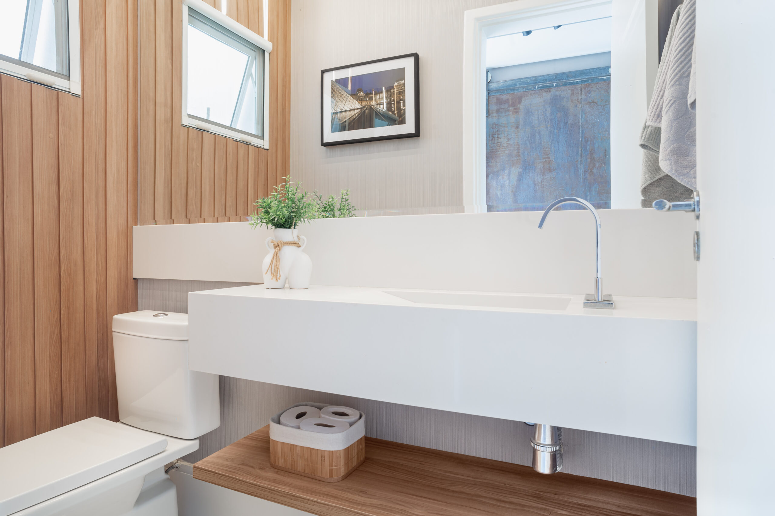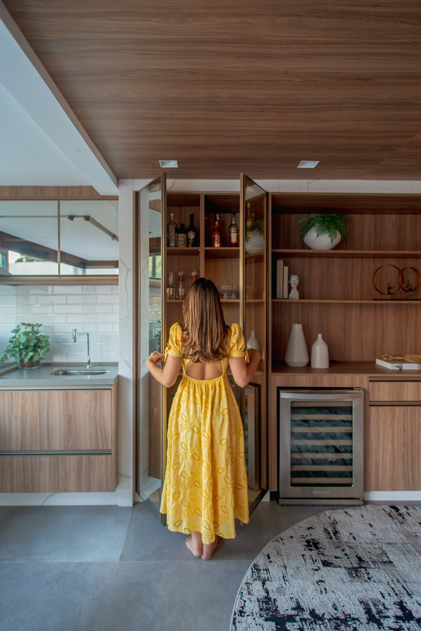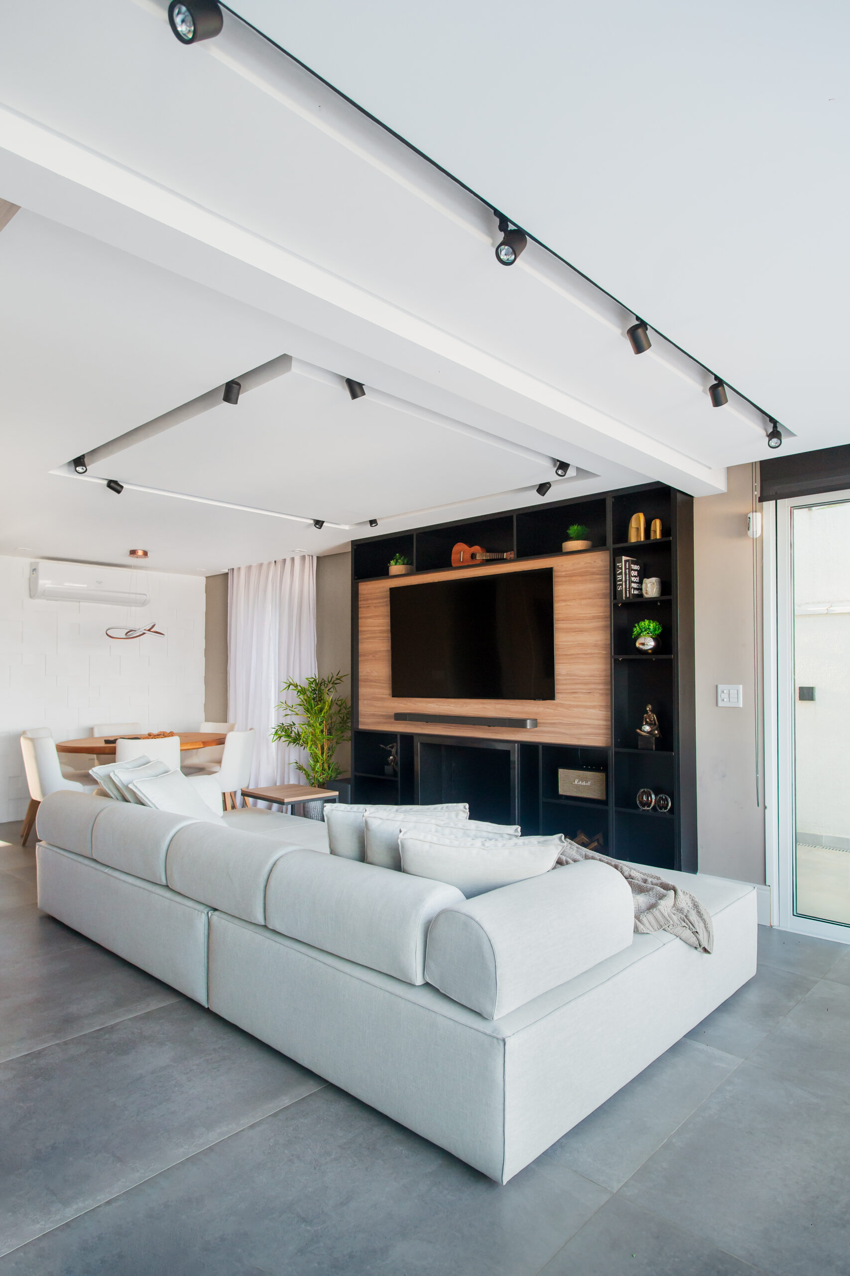 Neste projeto, a marcenaria é o elemento estrutural que conecta living, bar e área gourmet. A execução da Blomarq combina um extenso painel amadeirado, que aquece o ambiente, com o contraponto sóbrio da laca preta no home theater. Detalhes como a adega climatizada integrada e a iluminação de LED precisa demonstram nossa capacidade técnica de executar projetos de alto padrão para arquitetos.