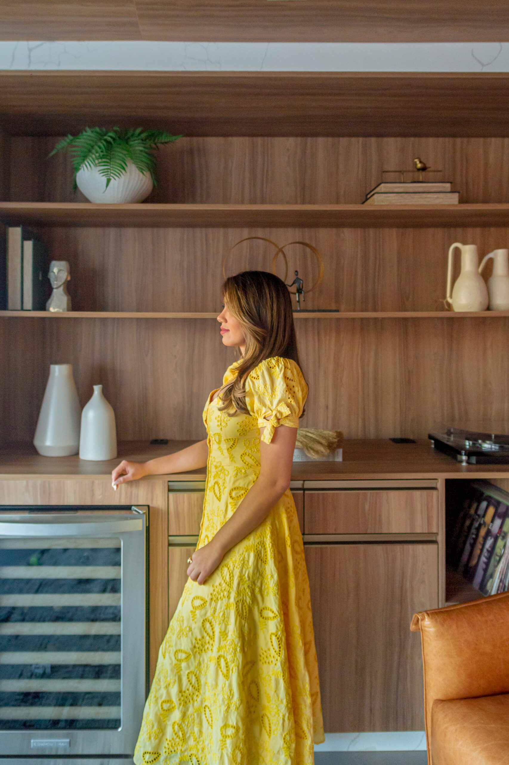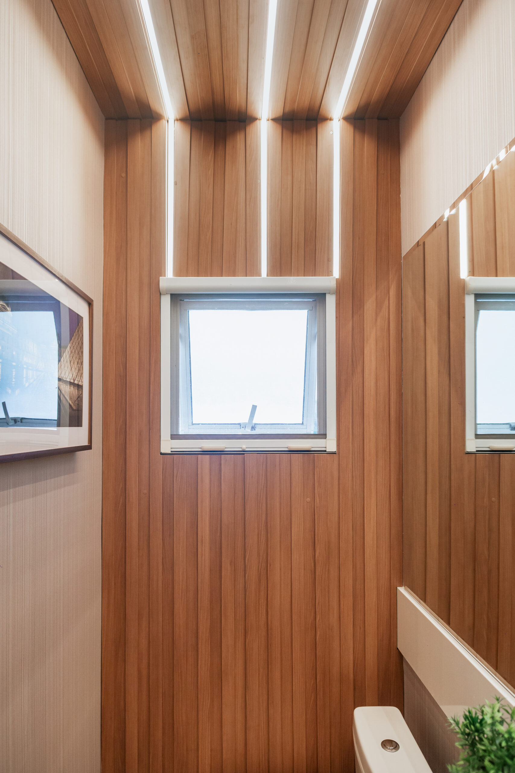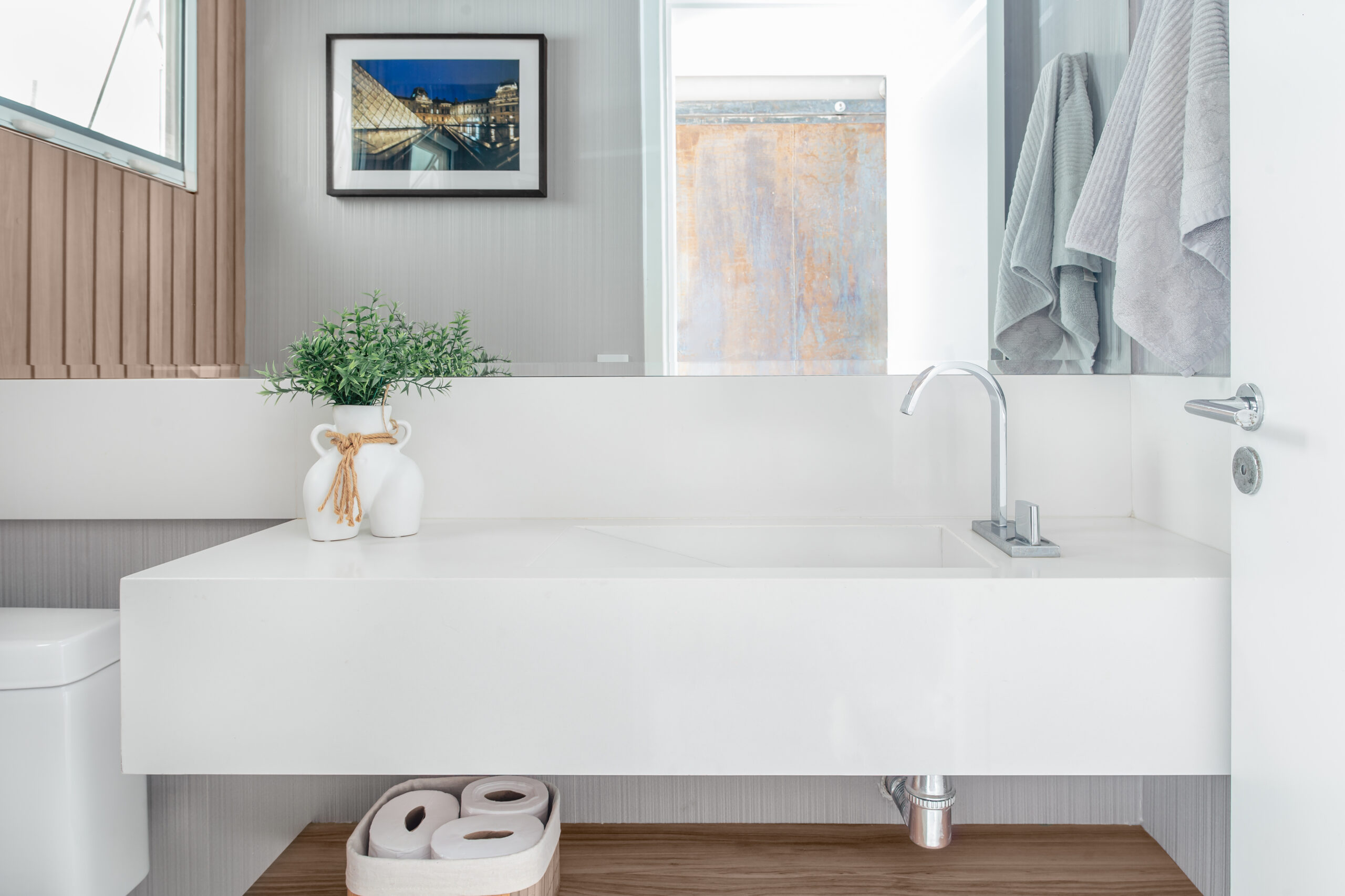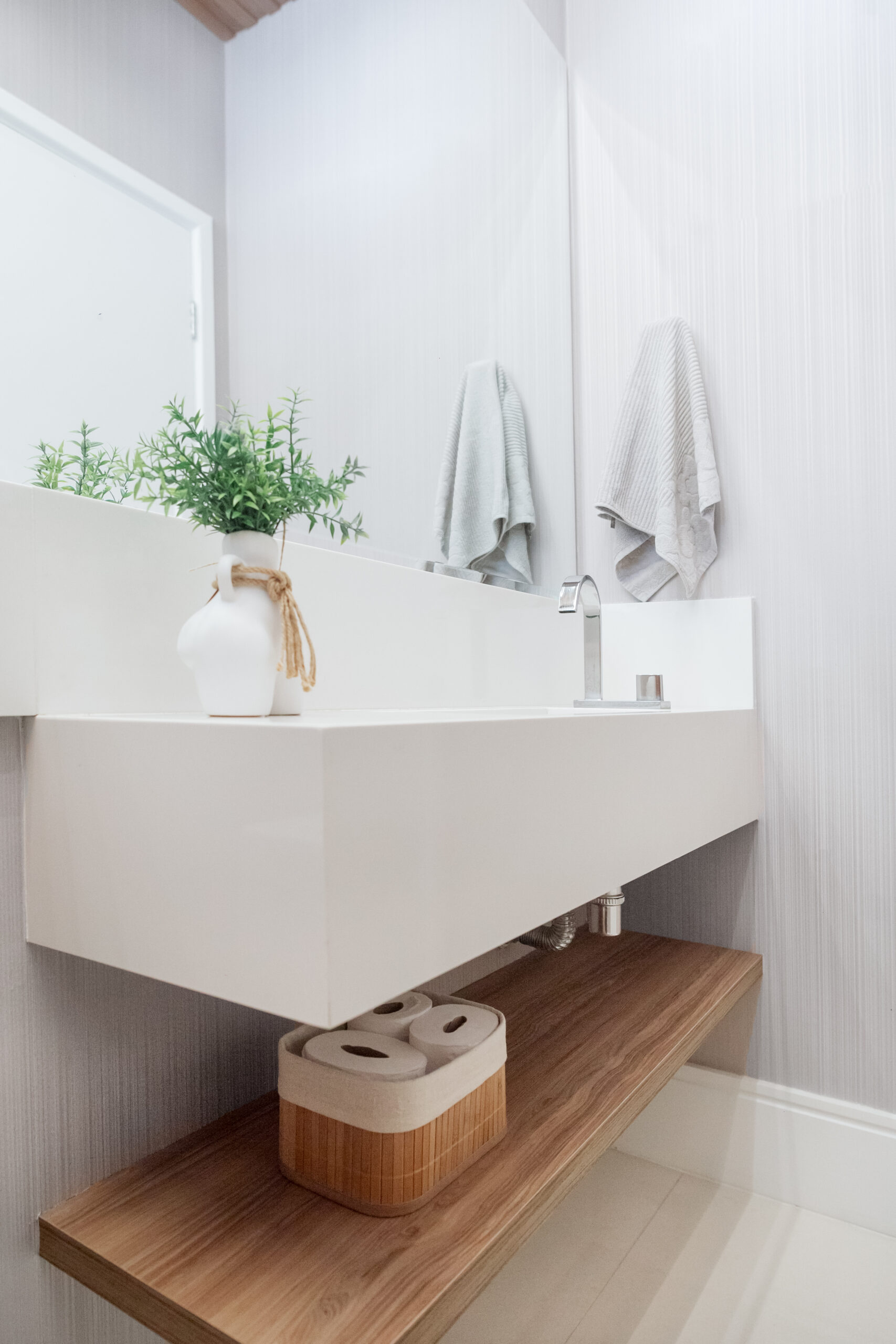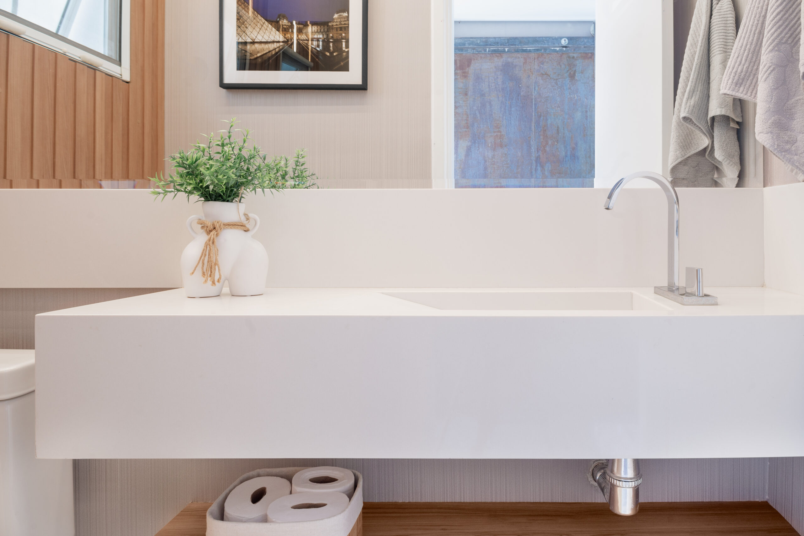 Neste projeto, a marcenaria é o elemento estrutural que conecta living, bar e área gourmet. A execução da Blomarq combina um extenso painel amadeirado, que aquece o ambiente, com o contraponto sóbrio da laca preta no home theater. Detalhes como a adega climatizada integrada e a iluminação de LED precisa demonstram nossa capacidade técnica de executar projetos de alto padrão para arquitetos.