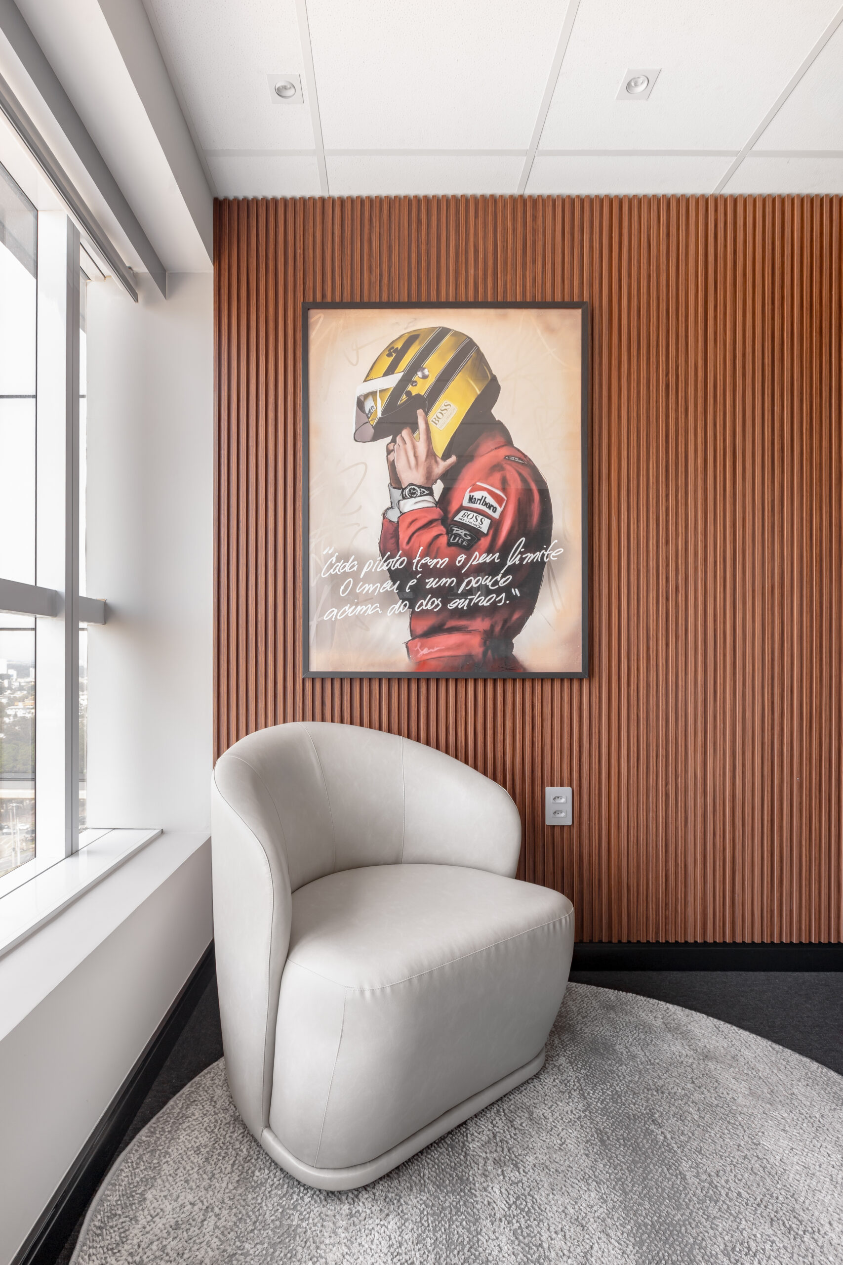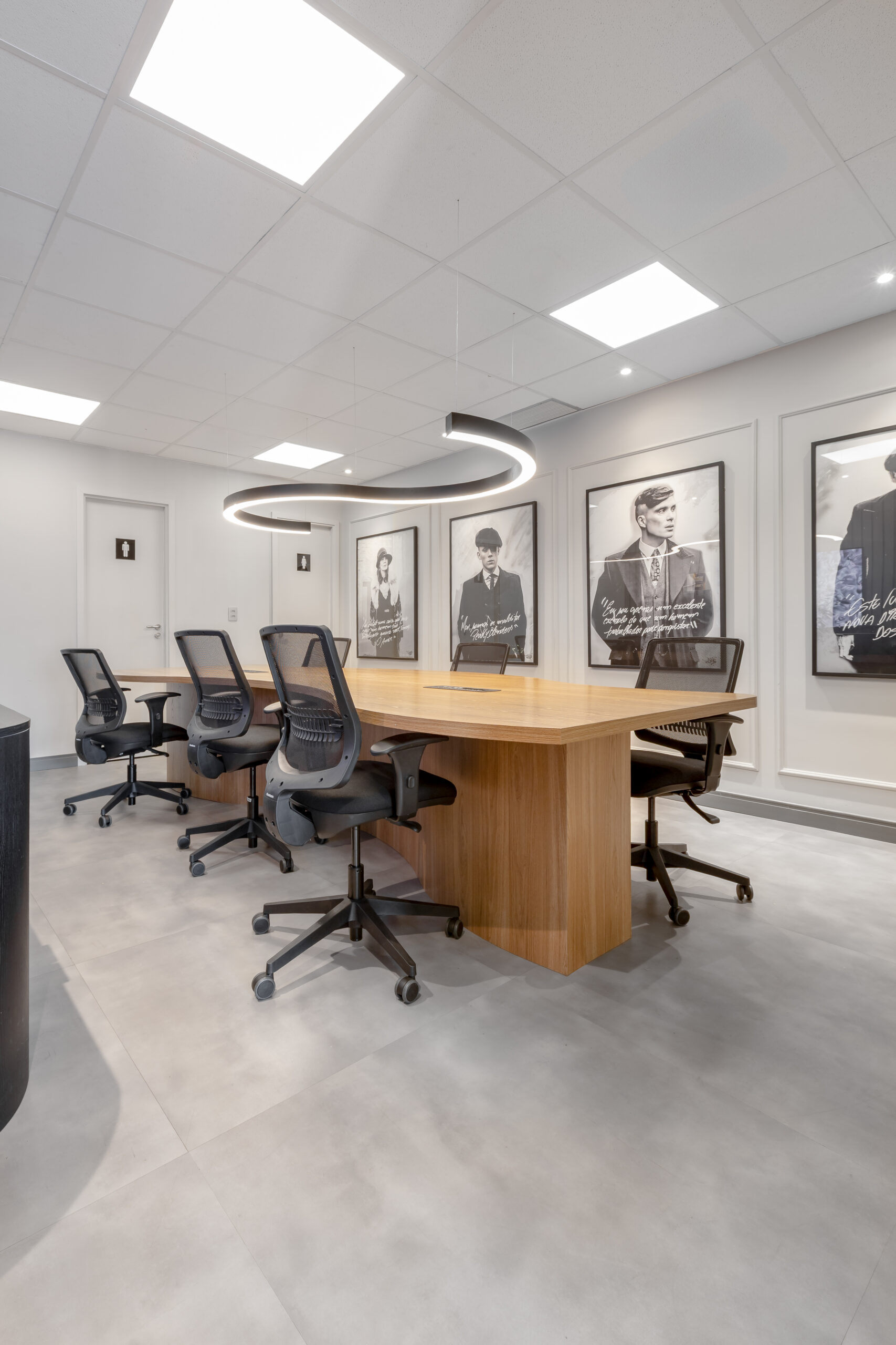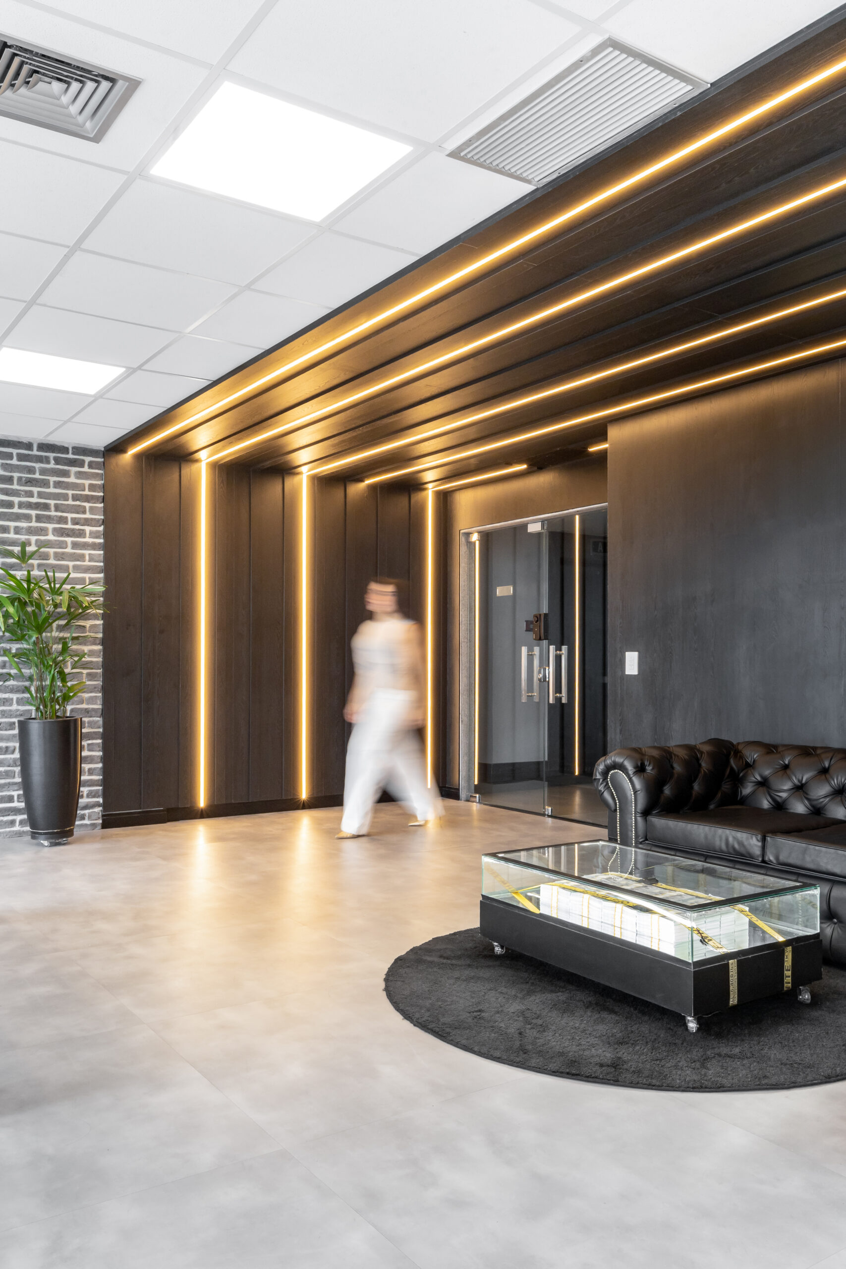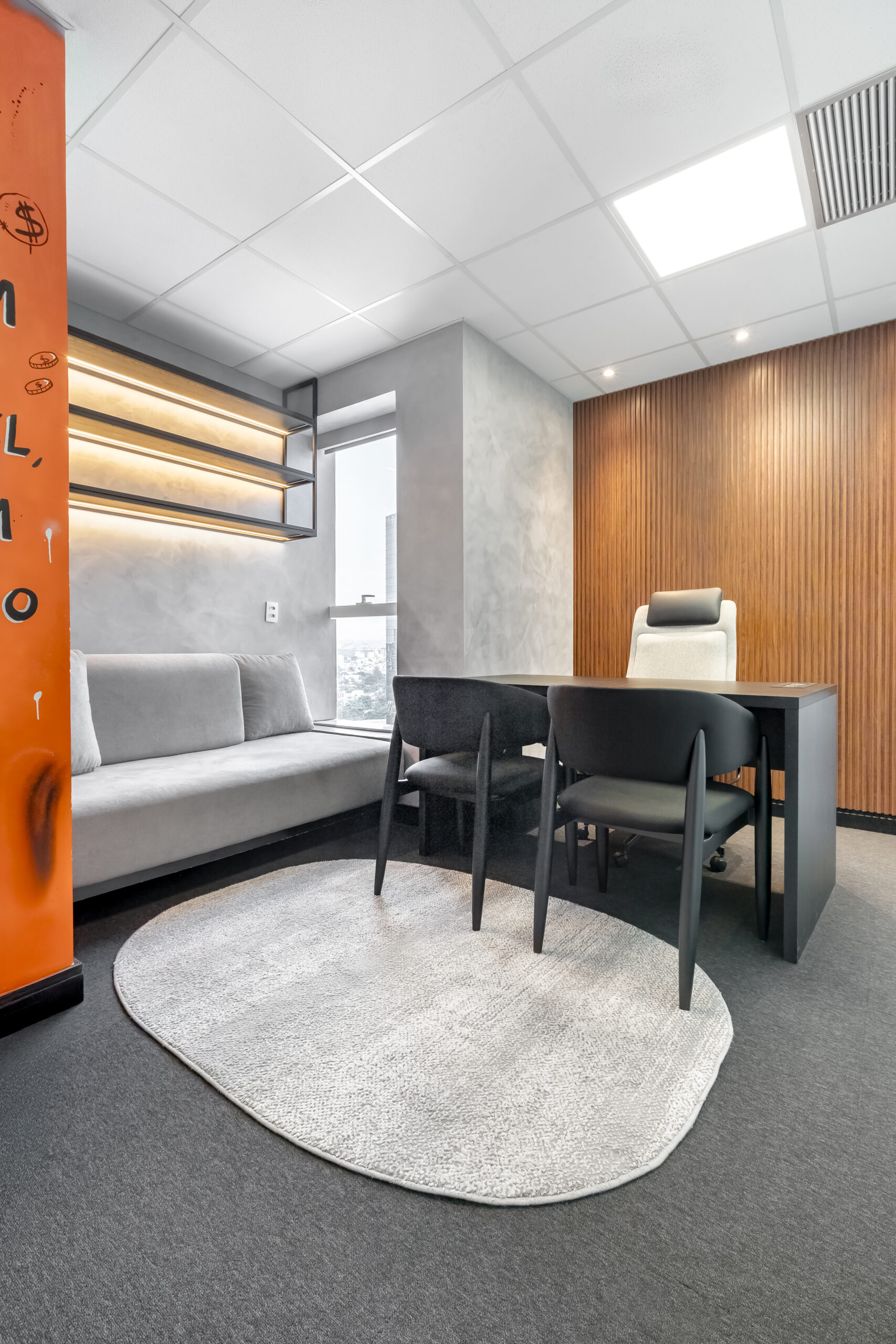 Este projeto corporativo impressiona pela estética urbana e sofisticada. A paleta escura, dominada por preto e cinza, é quebrada por tijolo aparente e painéis ripados (pretos e terracota). A iluminação linear em LED âmbar é protagonista, definindo os espaços. O design mescla áreas de trabalho com zonas de descompressão (sinuca, sofás Chesterfield), criando uma identidade de marca forte, moderna e descolada.