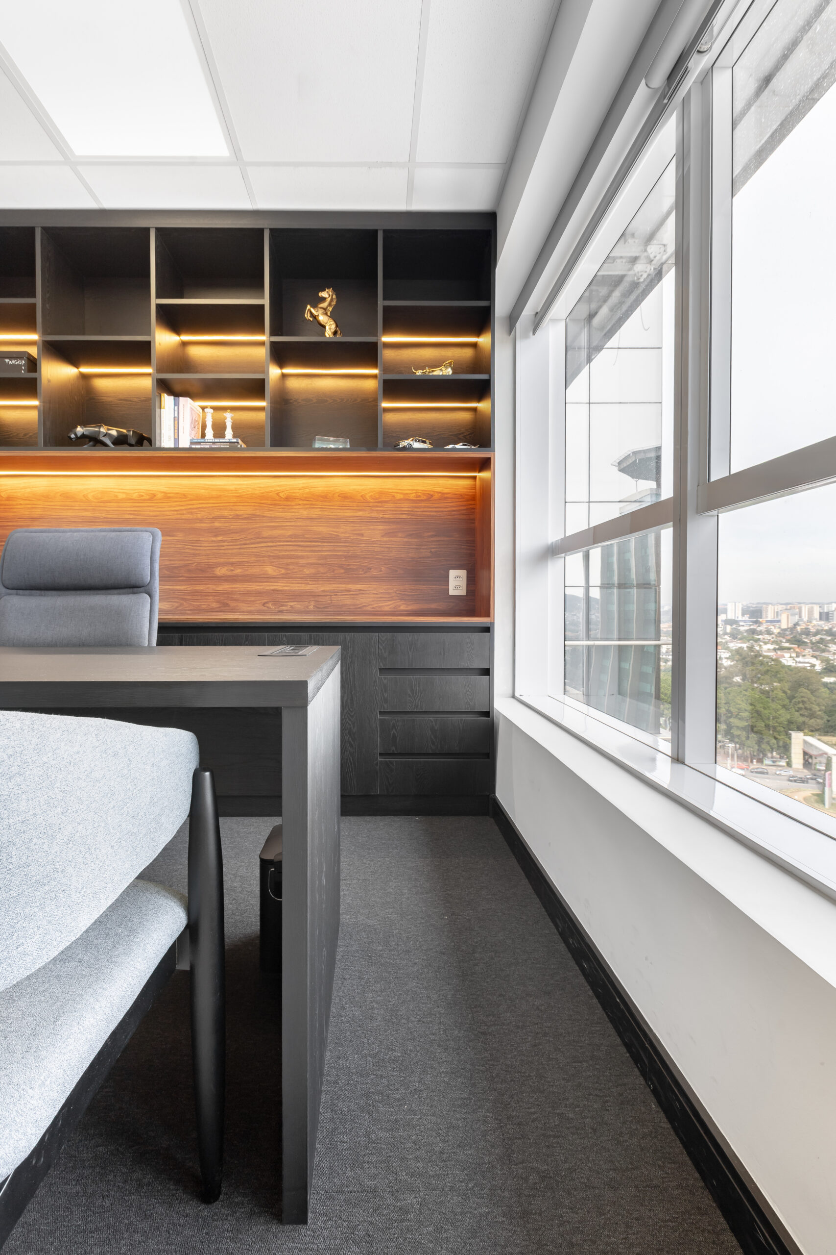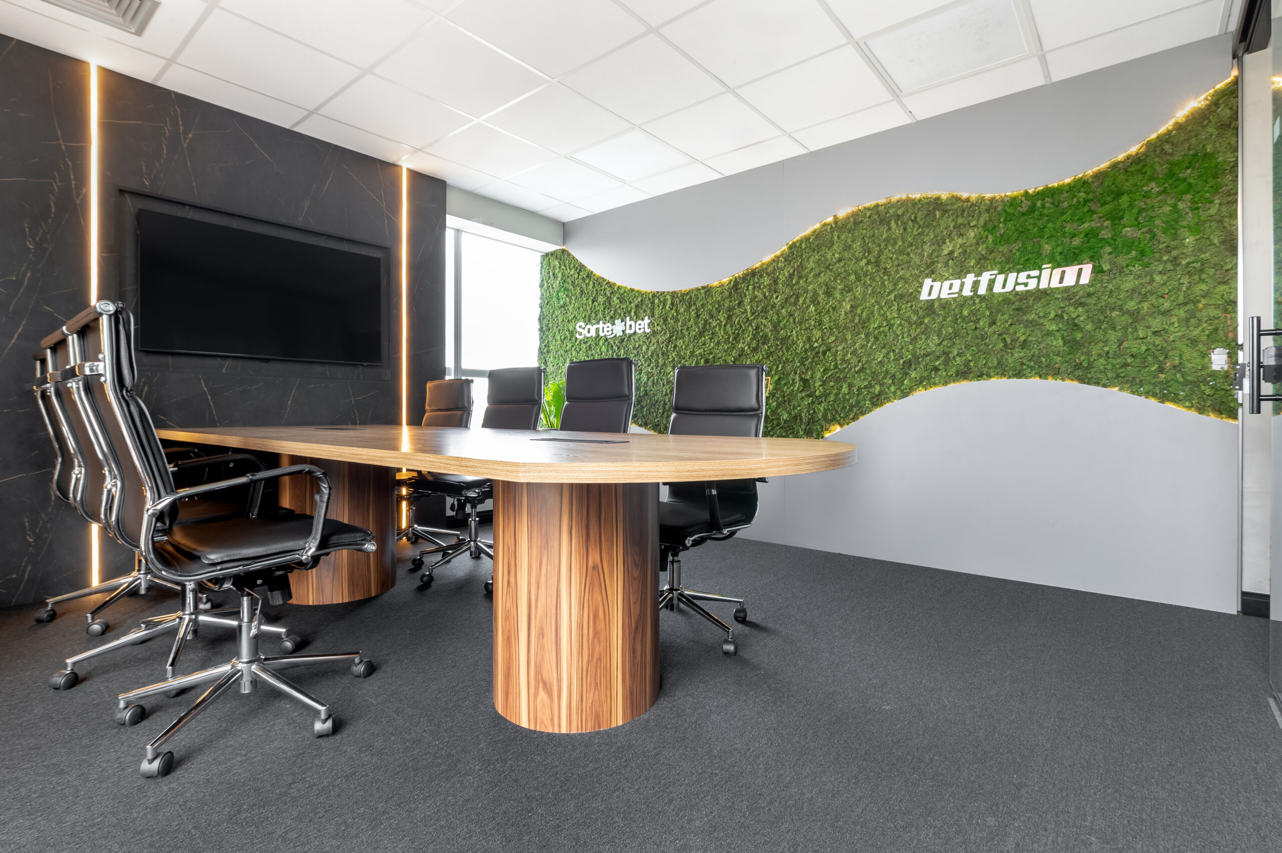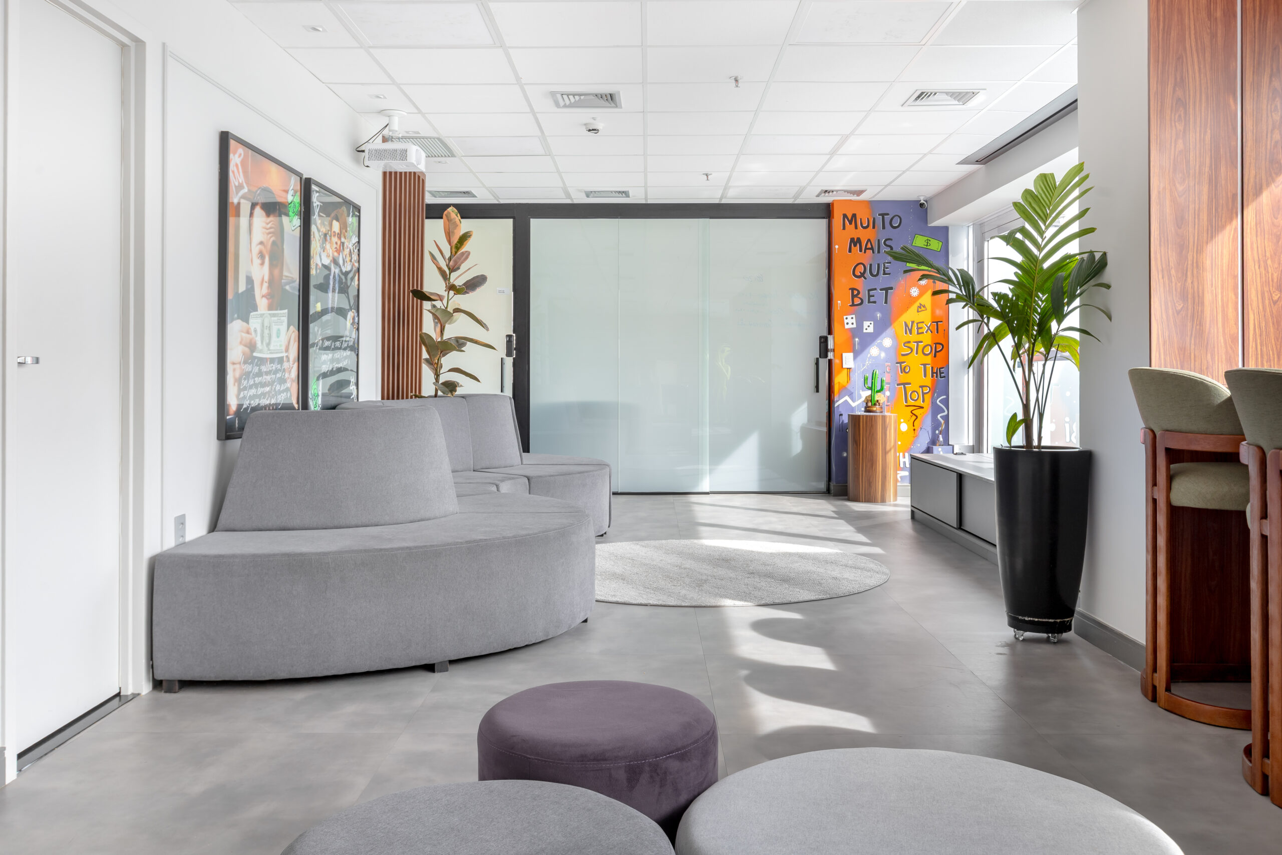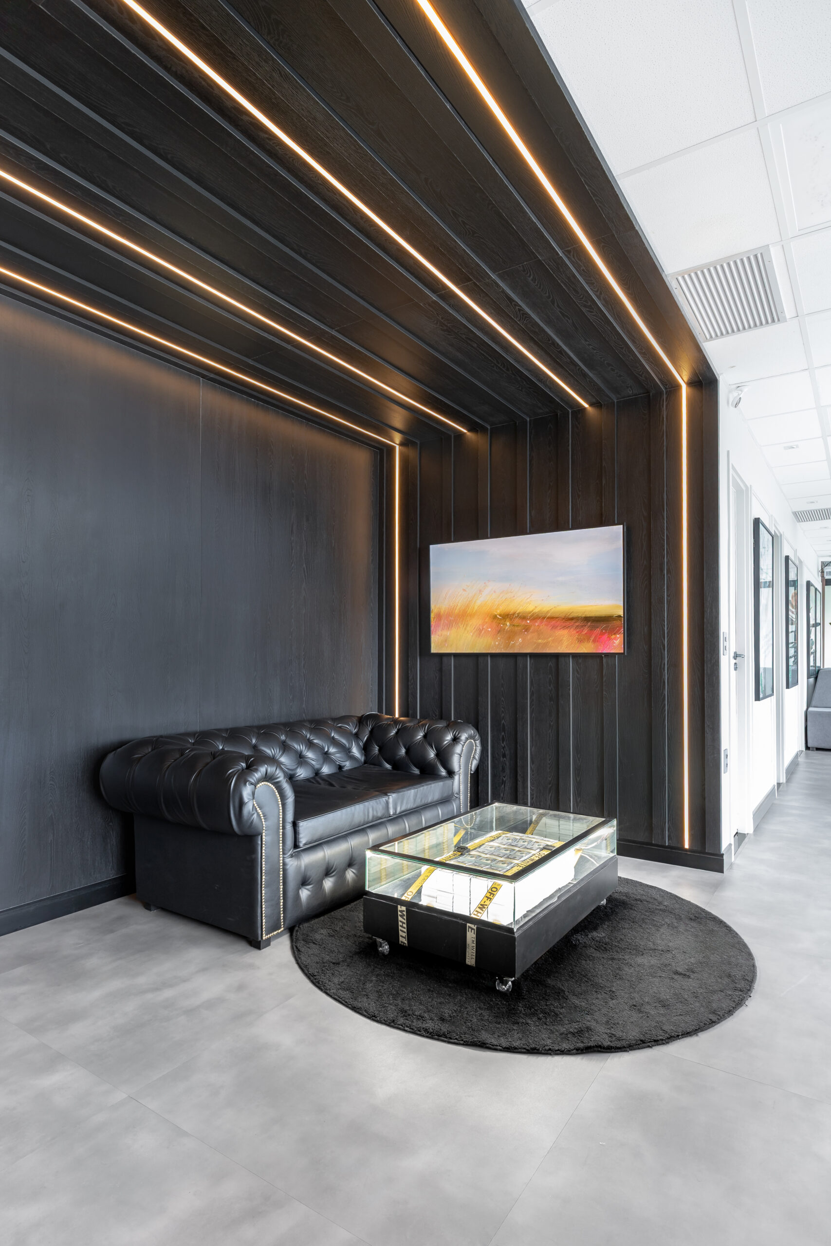 Este projeto corporativo impressiona pela estética urbana e sofisticada. A paleta escura, dominada por preto e cinza, é quebrada por tijolo aparente e painéis ripados (pretos e terracota). A iluminação linear em LED âmbar é protagonista, definindo os espaços. O design mescla áreas de trabalho com zonas de descompressão (sinuca, sofás Chesterfield), criando uma identidade de marca forte, moderna e descolada.