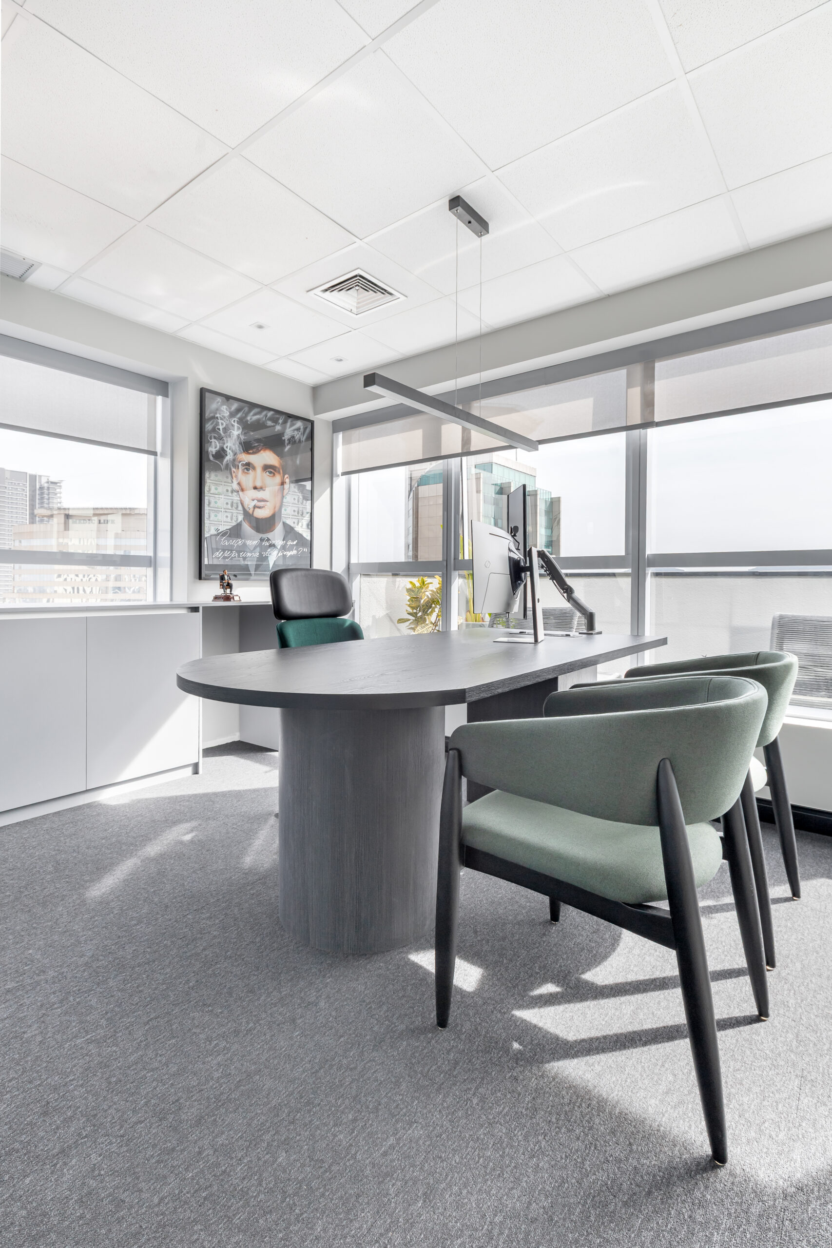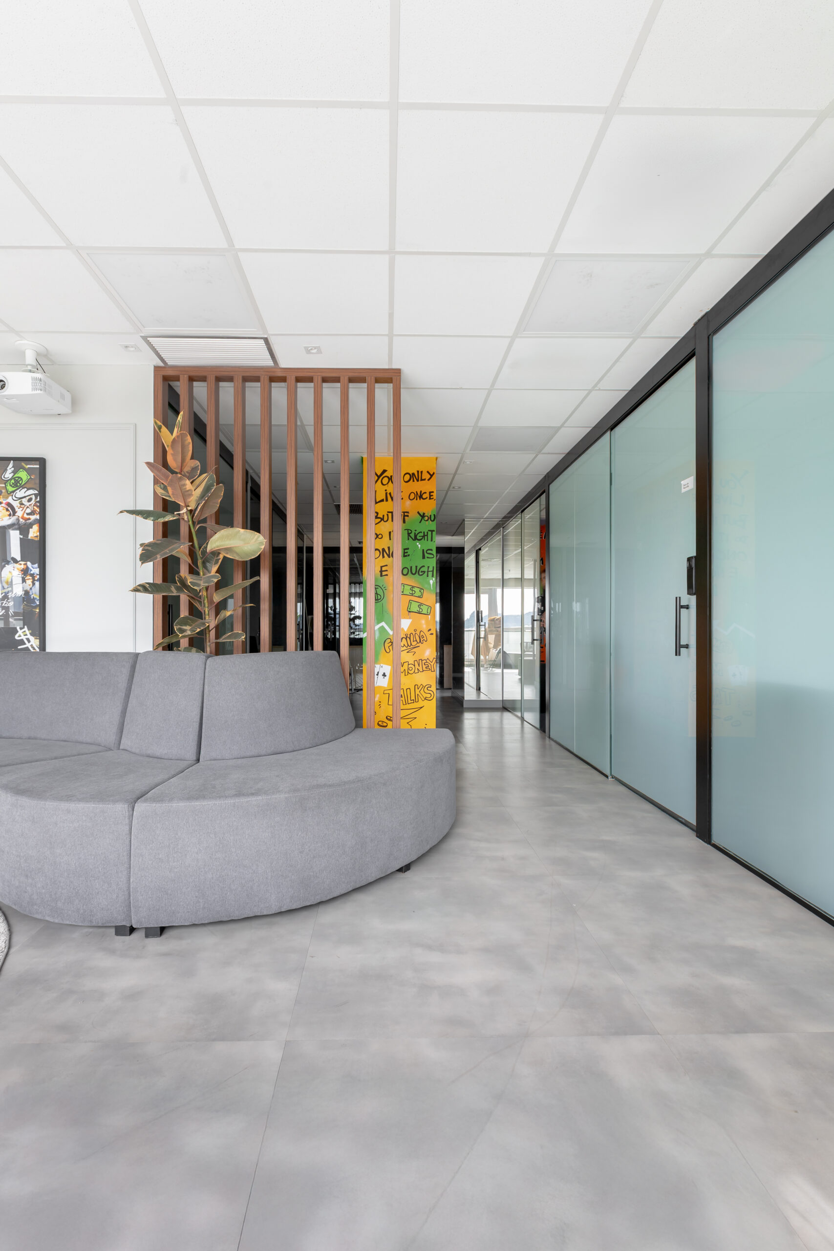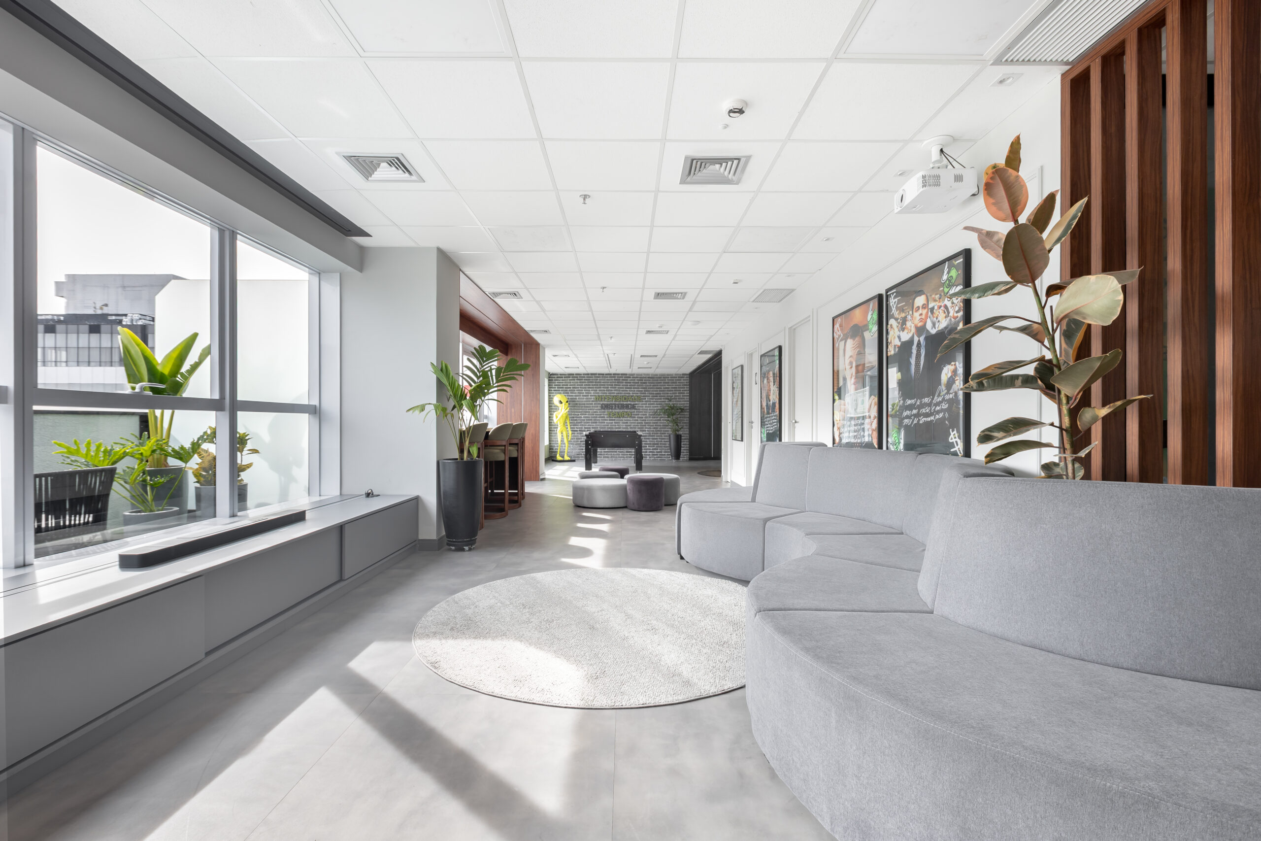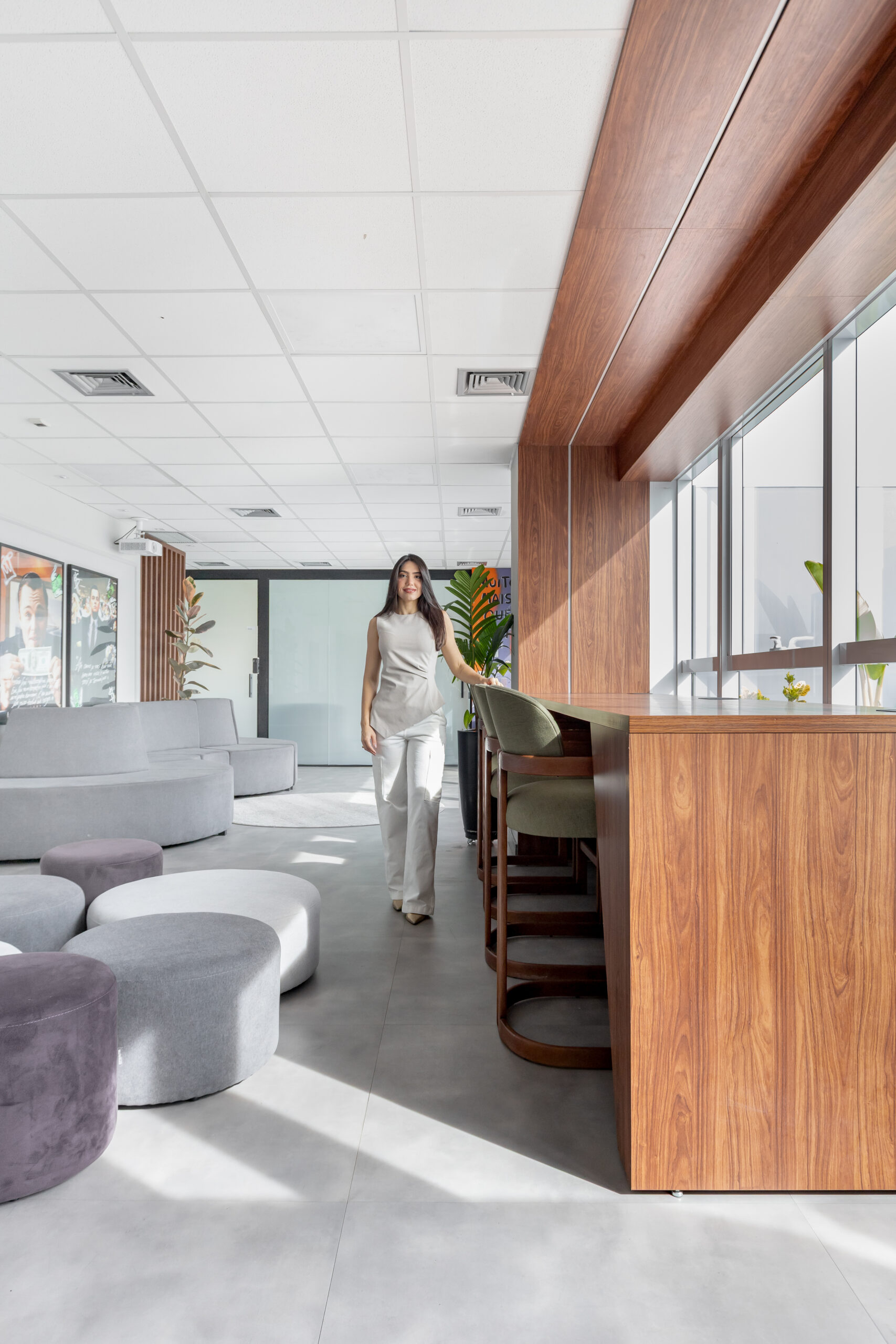 Este projeto corporativo impressiona pela estética urbana e sofisticada. A paleta escura, dominada por preto e cinza, é quebrada por tijolo aparente e painéis ripados (pretos e terracota). A iluminação linear em LED âmbar é protagonista, definindo os espaços. O design mescla áreas de trabalho com zonas de descompressão (sinuca, sofás Chesterfield), criando uma identidade de marca forte, moderna e descolada.
