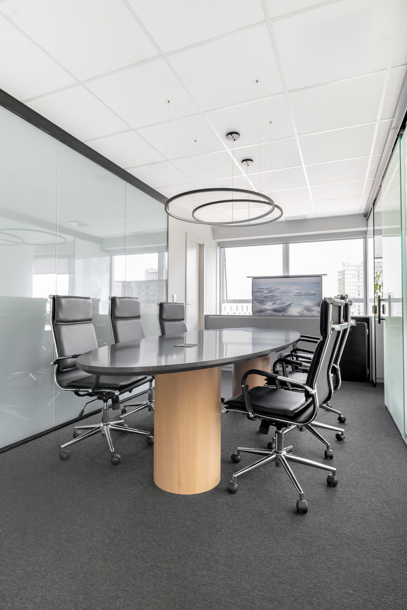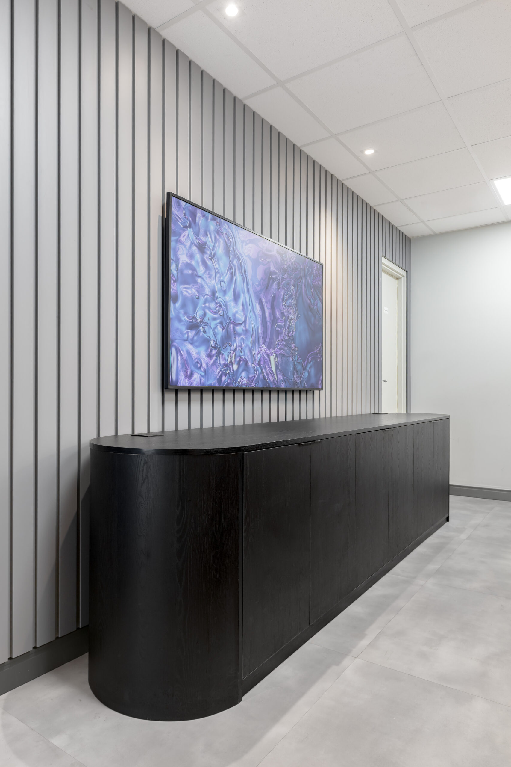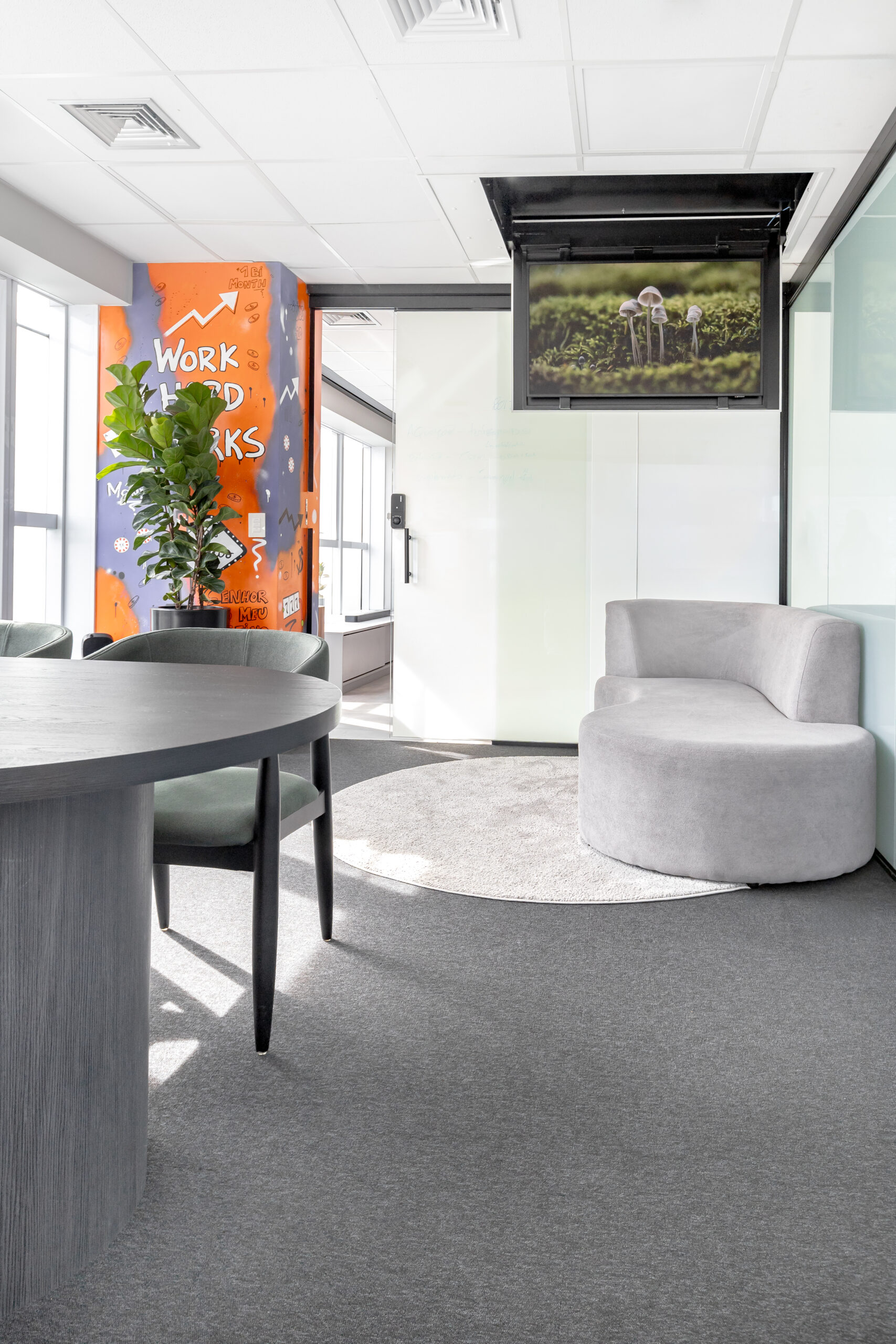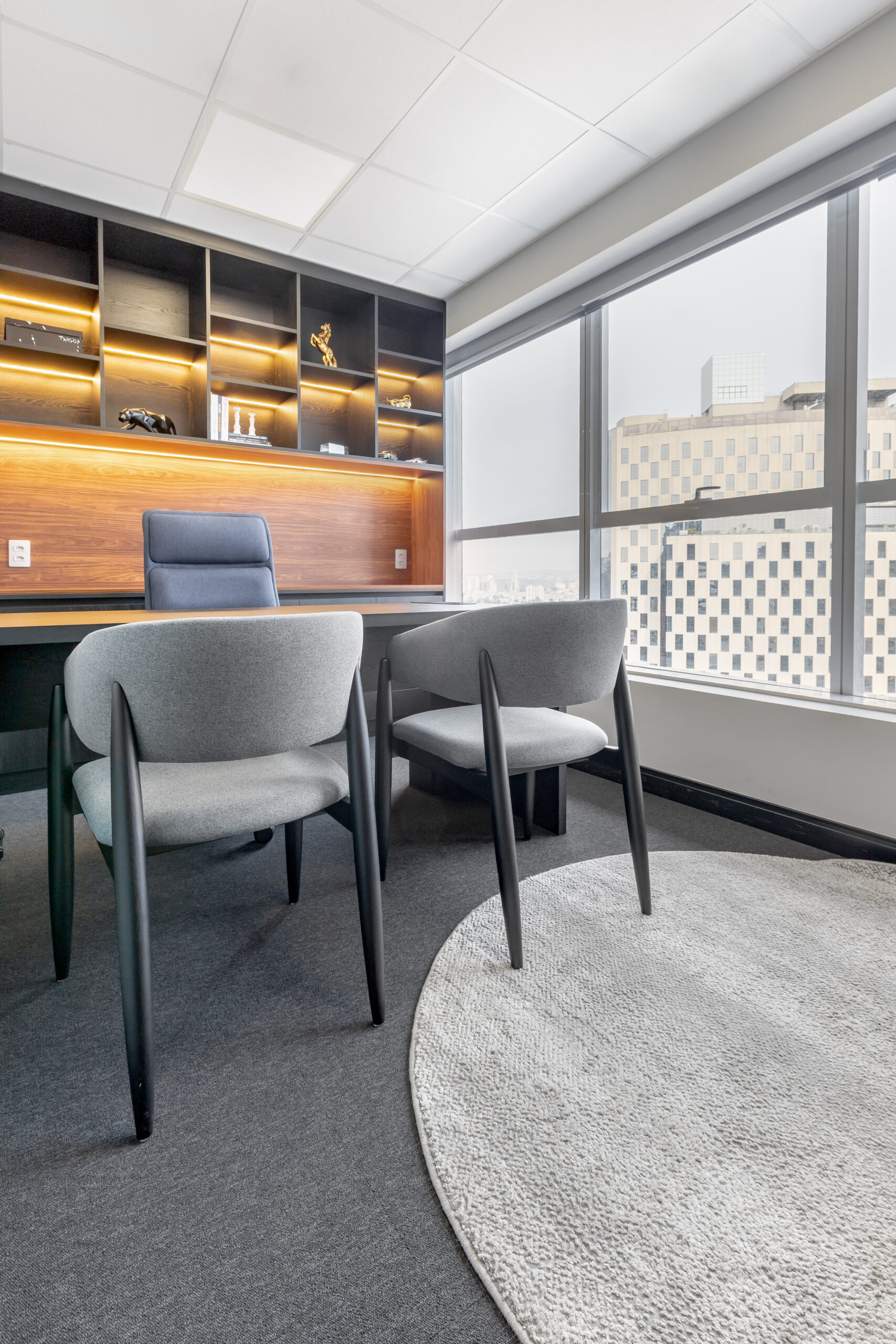 Este projeto corporativo impressiona pela estética urbana e sofisticada. A paleta escura, dominada por preto e cinza, é quebrada por tijolo aparente e painéis ripados (pretos e terracota). A iluminação linear em LED âmbar é protagonista, definindo os espaços. O design mescla áreas de trabalho com zonas de descompressão (sinuca, sofás Chesterfield), criando uma identidade de marca forte, moderna e descolada.