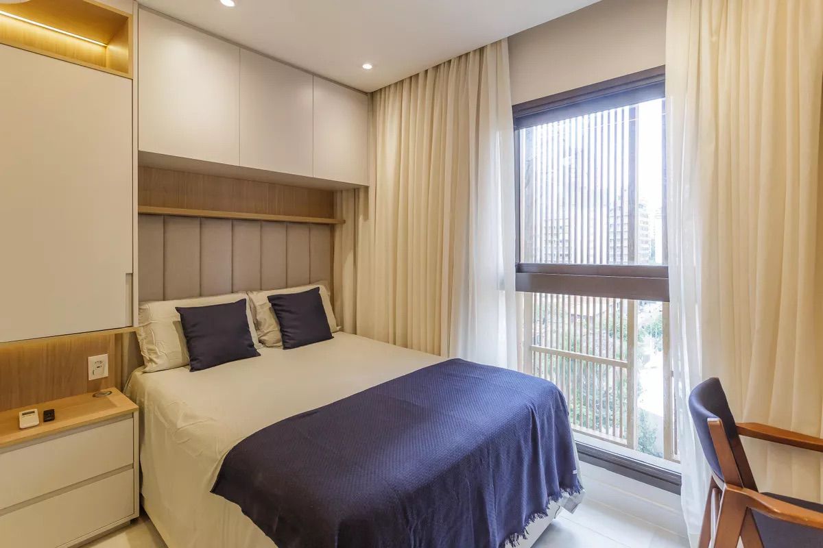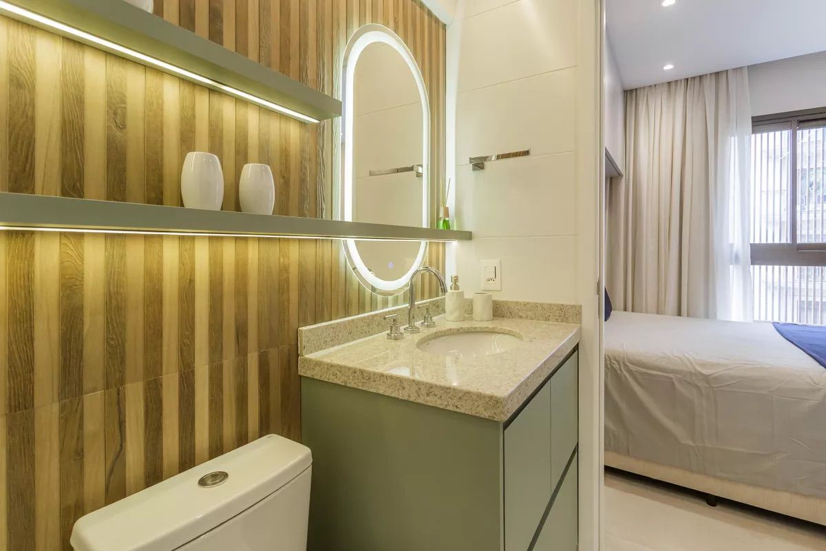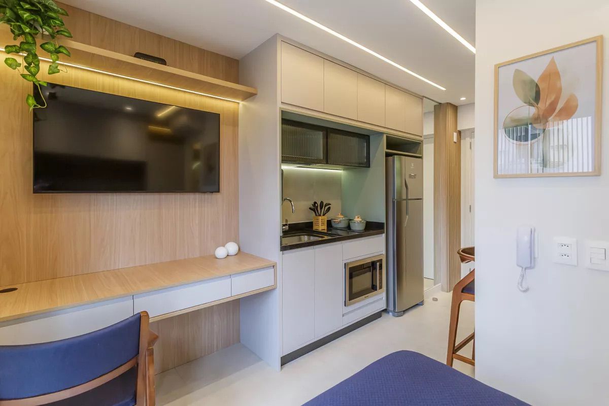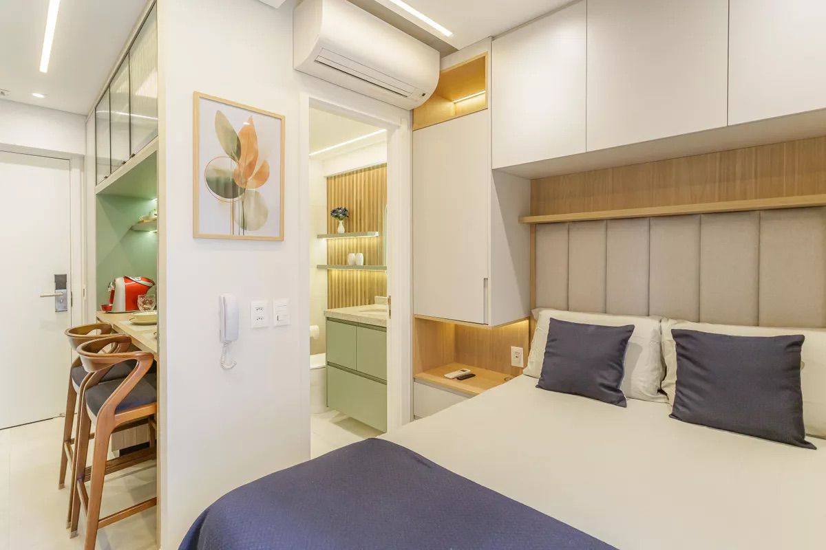 Projeto contemporâneo e funcional, pensado para otimizar espaços compactos com elegância. A paleta clara amplia a percepção de amplitude, enquanto a marcenaria sob medida, a iluminação linear e os nichos integrados garantem conforto, fluidez e sofisticação no uso diário.